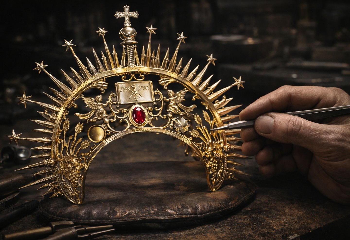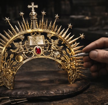 Este tipo de trabajos incluye piezas singulares como coronas, diademas, remates, emblemas especiales y otros elementos destinados a imágenes titulares o a uso litúrgico.