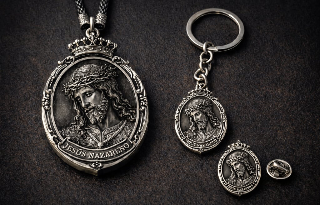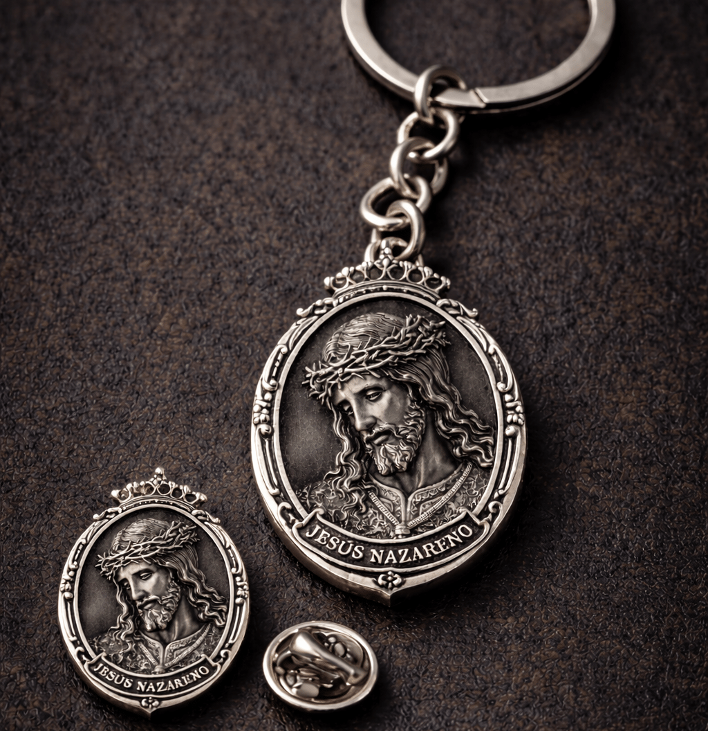 Los pins y llaveros son especialmente habituales en aniversarios, eventos conmemorativos o como complemento a otros encargos, permitiendo ampliar la presencia de la cofradía más allá del uso procesional.